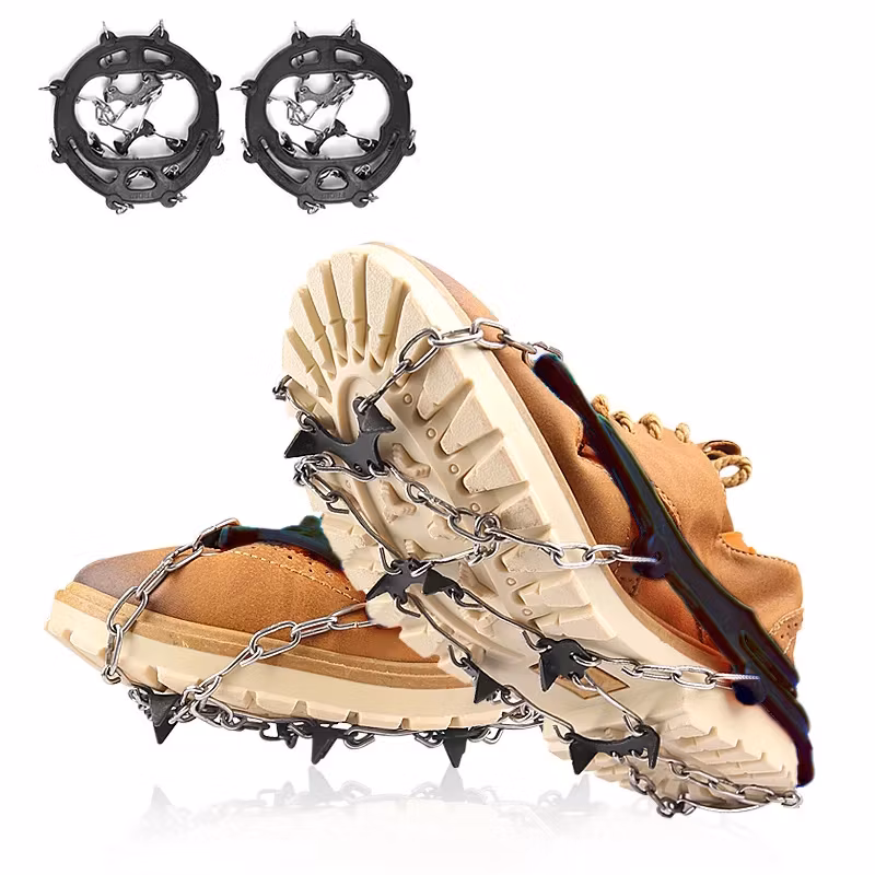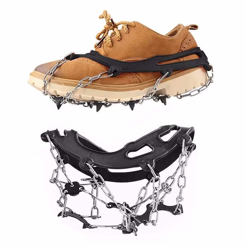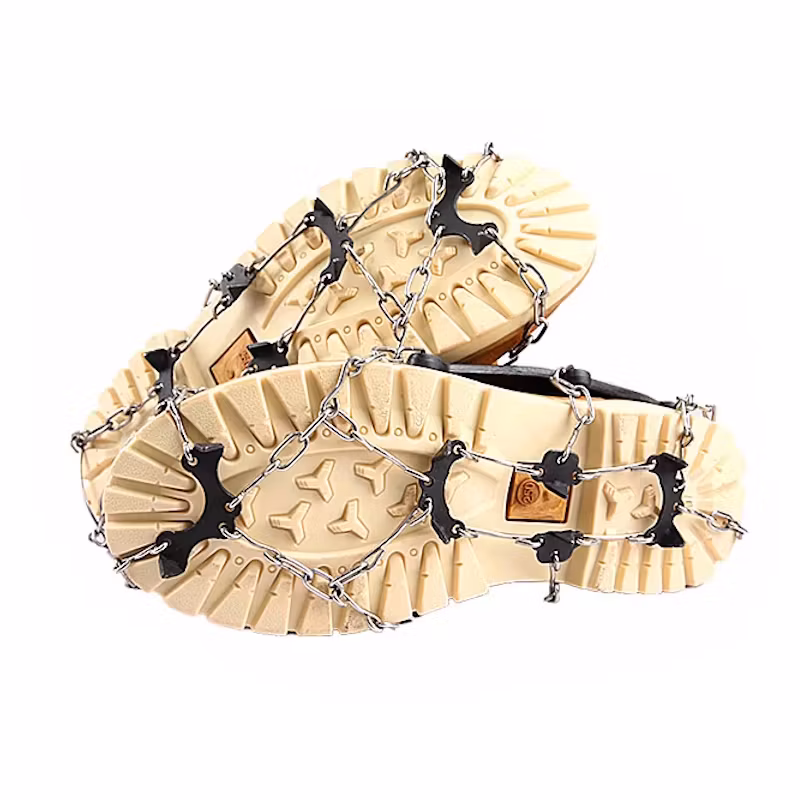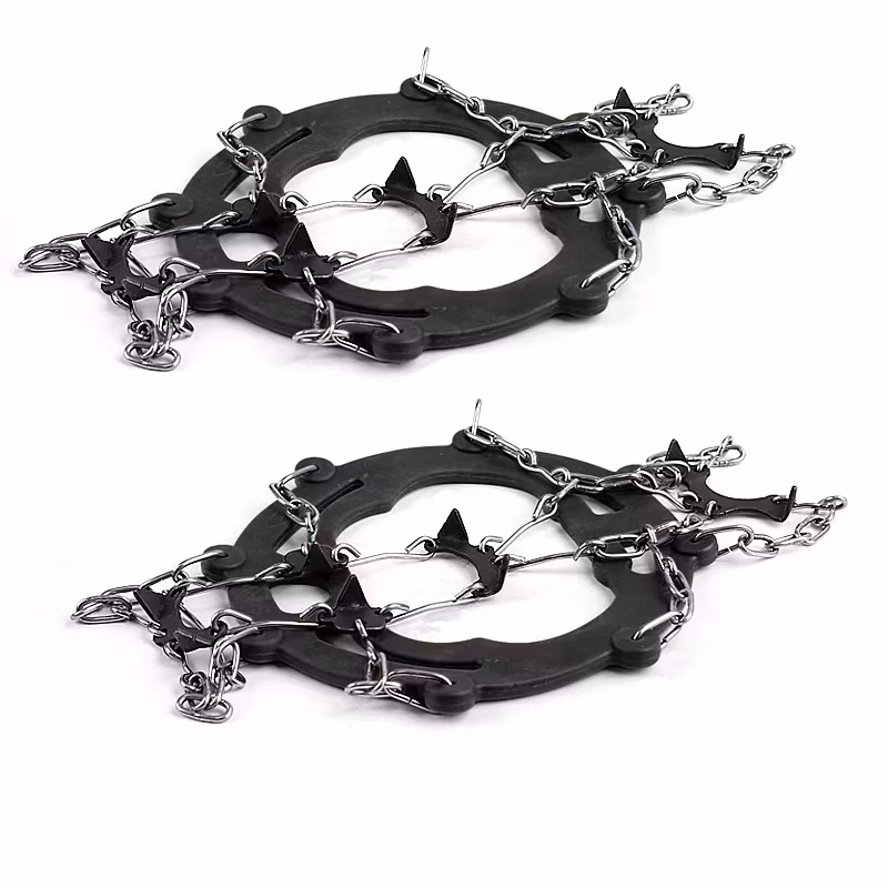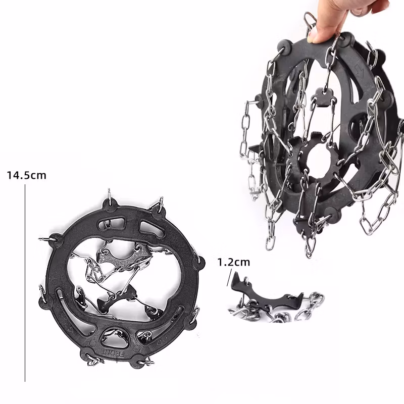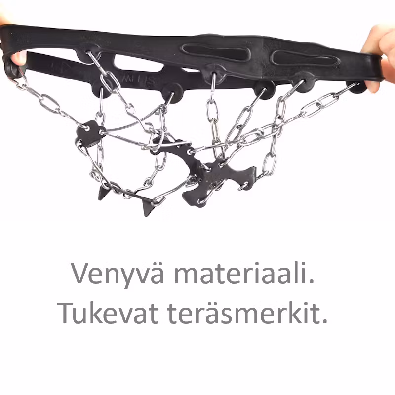 - 16 terästankoa + ketjut: 16 terästankoa ovat 1,2 cm korkeita, ja yhdessä ketjujen kanssa ne antavat erittäin varman otteen liukkailla ja epätasaisilla pinnoilla, joten voit kävellä luottavaisin mielin myös jäisillä ja lumisilla pinnoilla.